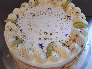 Tejszínes vaníliás cukrászkrémmel töltött torta. (külön kérésre mazsolával) 25cm Az ár tartalmazza a díszítést, valamint a tortadobozt.